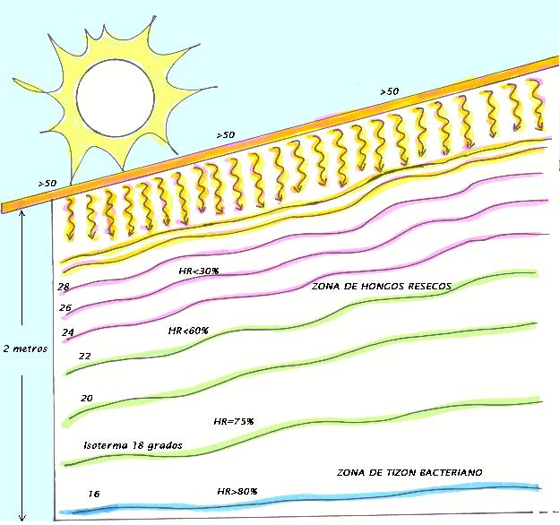 | El techo absorbe una gran cantidad de energía solar. En los lugares cálidos los techos de lámina metálica o de asbesto se calientan tanto que se pueden freír huevos en su superficie y en el caso de plásticos transparentes la luz penetra pero no puede salir el calor por lo que la nave puede rebasar los 40 grados matando a los hongos o marchitando los brotes de inmediato pues entre más alta es la temperatura la humedad relativa es menor (para una misma cantidad de agua absoluta). Los techos irradian el calor hacia dentro de la nave y si el aire está quieto entonces se forman zonas de diferente temperatura llamadas isotermas (ver figura). |